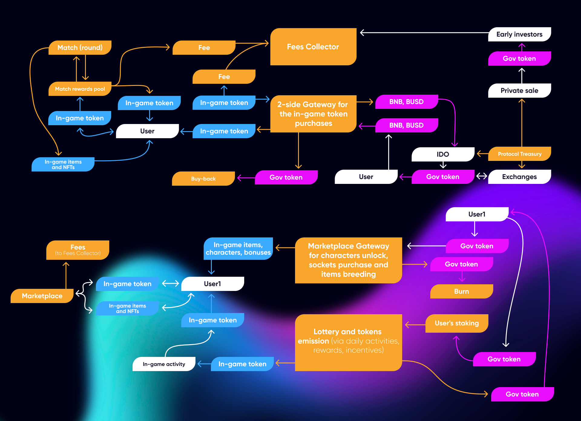 3️⃣ Marketplace – the game marketplace will offer different items that can be purchased only with the help of the governance token. These will be auxiliary and non-game items that will not affect game mechanics so as not to stimulate the donation mechanism. Also, users will be able to buy new game characters and particular items to change the strategy of the matches.