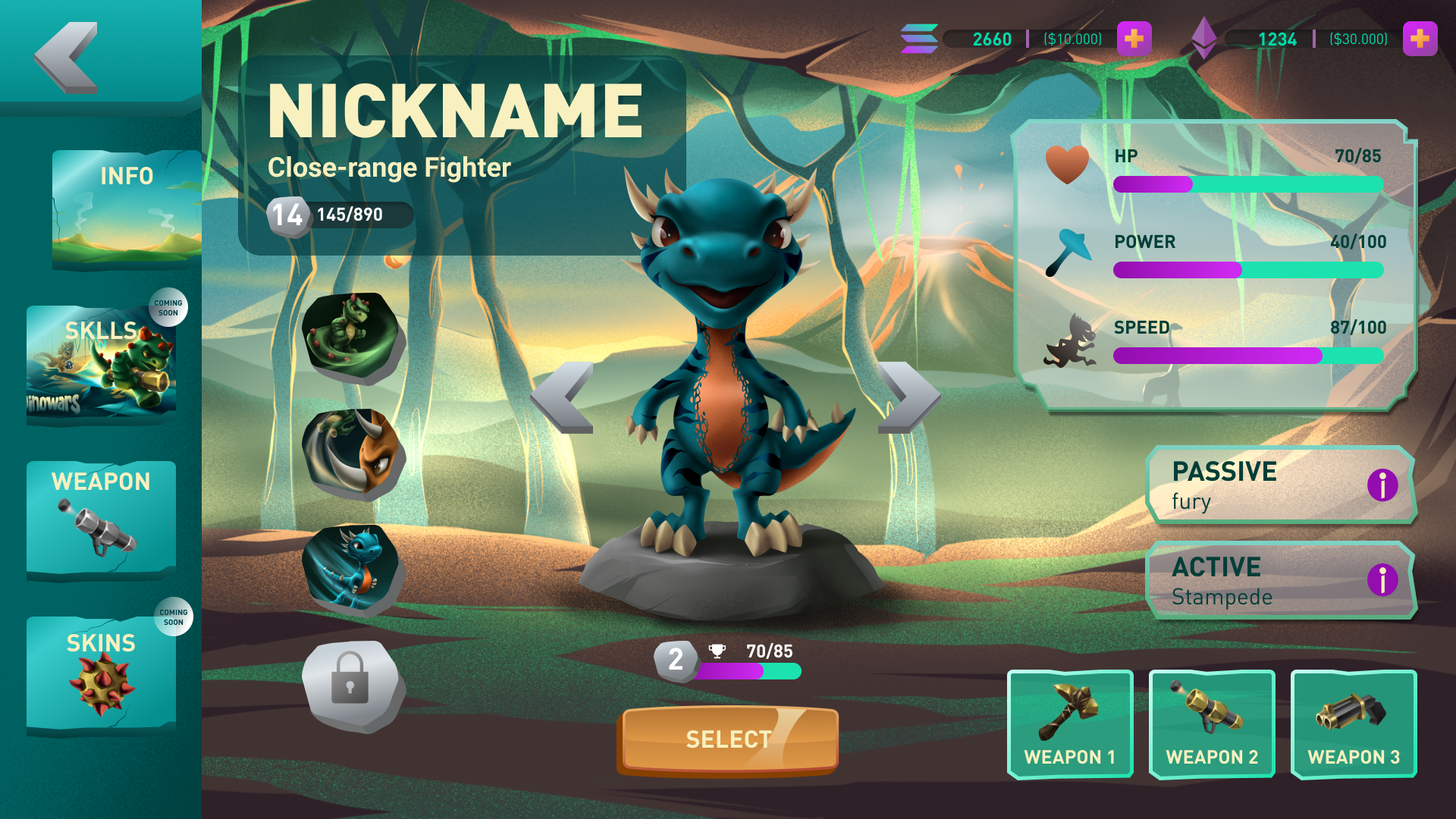 To participate in matches, the player chooses one of the in-game characters. Each character is unique and has its own set of skills and a special appearance. Several unique strategies can be developed based on the character. At the initial stage of release, each DinoWars 🦖 participant will have 3 characters to choose from There are plans for at least 15 characters to be released monthly with subsequent updates. New characters will be available through lottery and event prizes or purchased on the marketplace with DINW tokens.