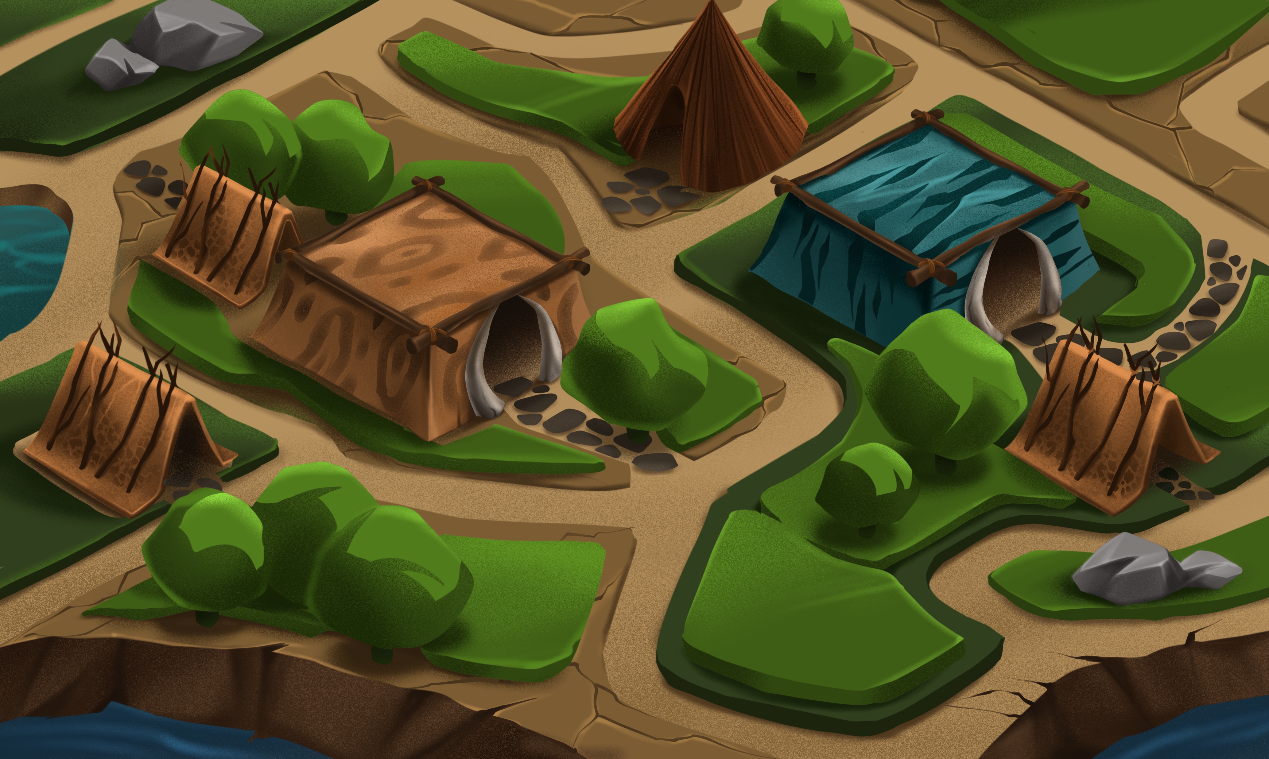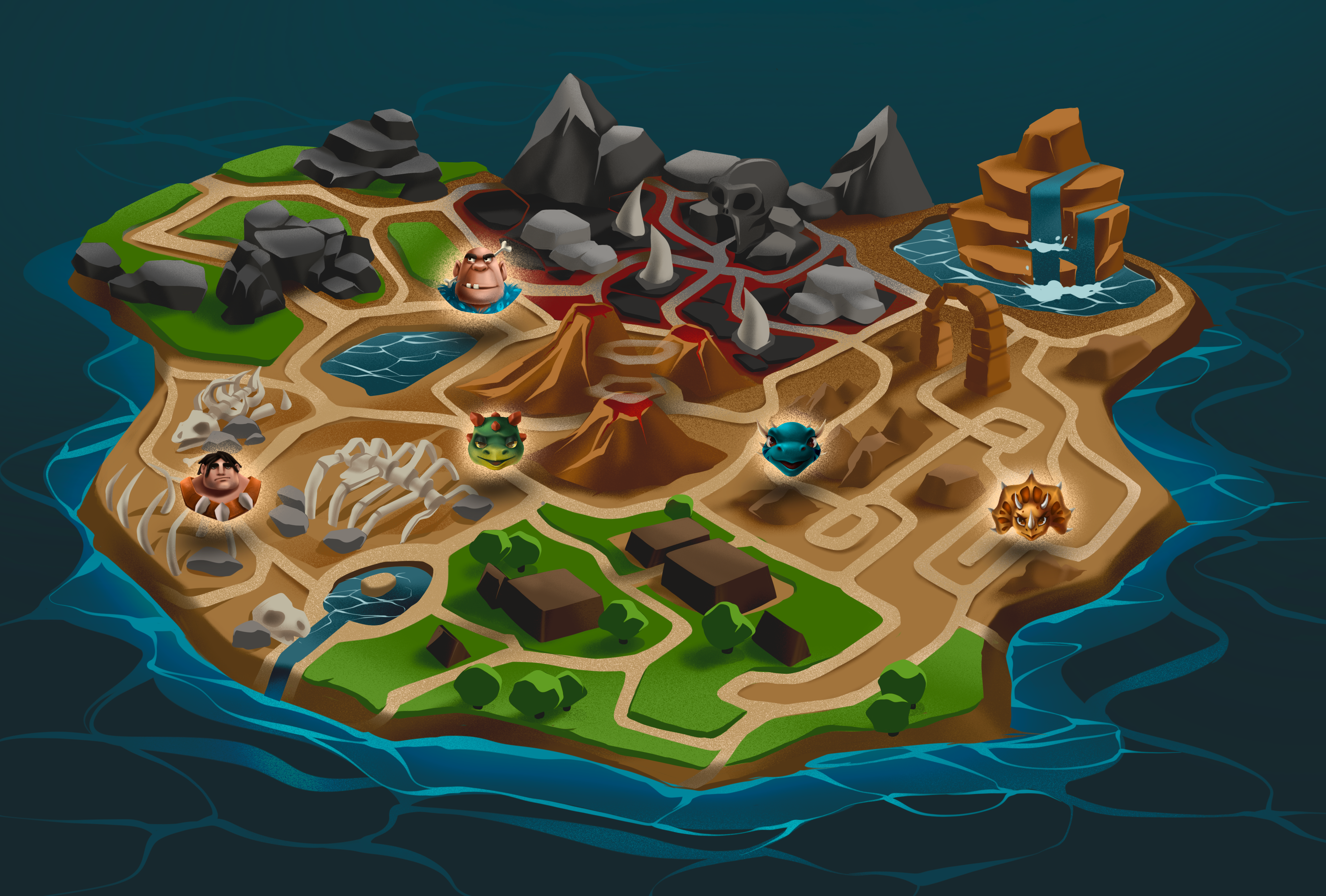 All players will compete on a large map corresponding to the prehistoric world's style. The map is divided into several terrains of different natures. Such an approach creates diversity for the application of different game strategies. Each terrain contains unique landscapes that you can use in your tactics. Bushes and lakes for ambushes, rocks and trees to hide behind, narrow paths where you can set traps, and vast areas for duels.